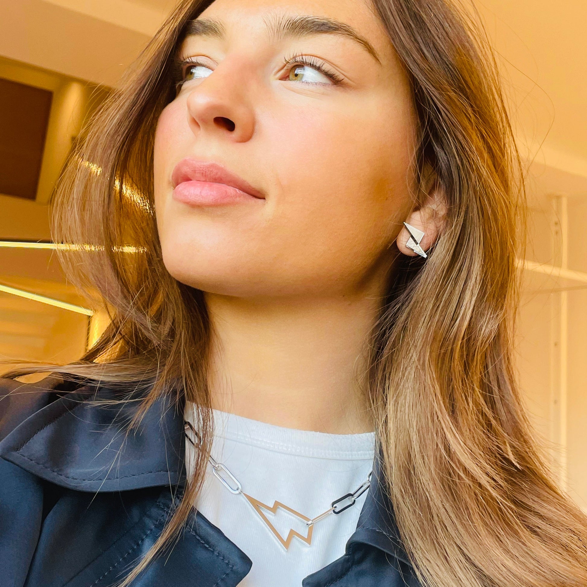 Notre collier POWER en acier inoxydable doré 18 carats ou rhodié se compose d'une chaîne trombone ajustable et de son éclair vibrant.